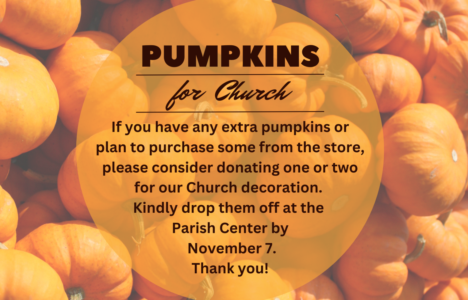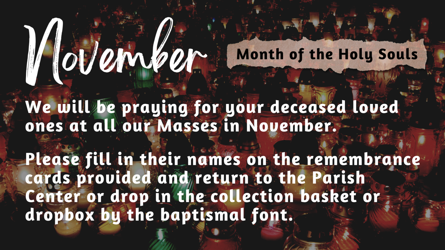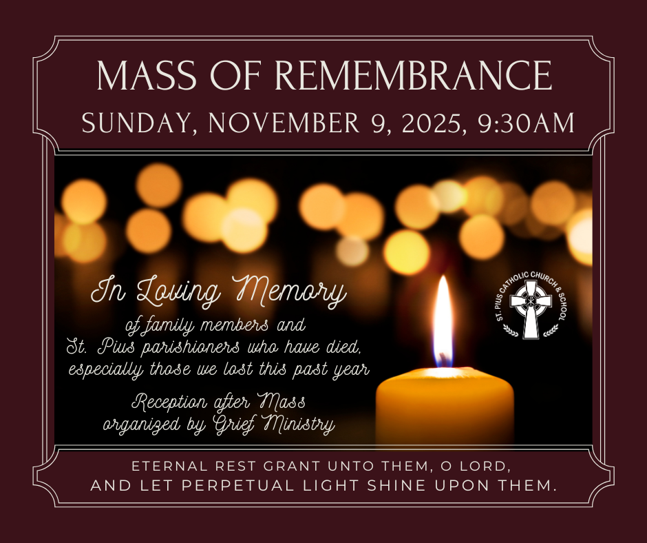 All are invited to the Mass of Remembrance on Sunday, Nov. 9 at 9:30 am, especially the families of those who died this past year, between October 1, 2024 to September 30, 2025. There will be a reception in the Parish Center after Mass.